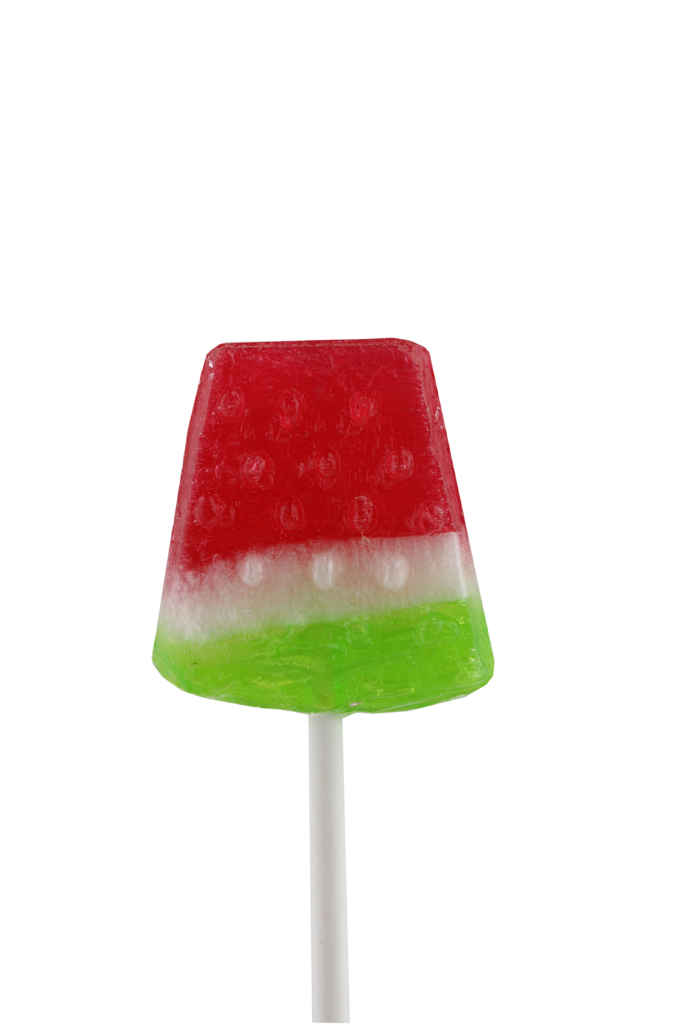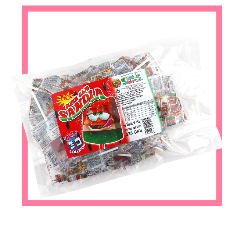Descripción: Original caramelo con palo en forma de tajada de sandía.  Irresistible sabor a sandía. Sin gluten.